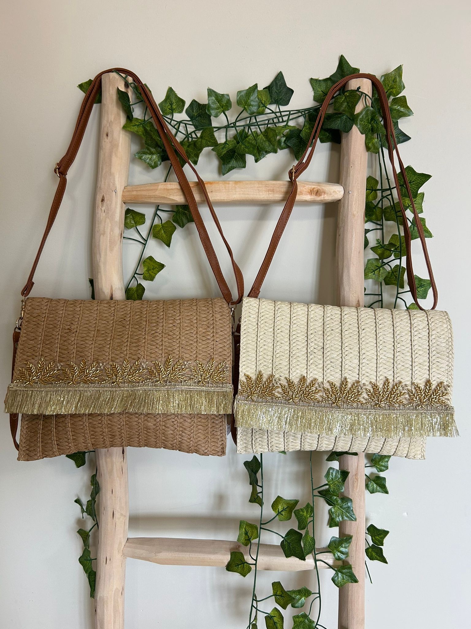 BOLSO TIPO RAFIA CON ABALORIOS DORADOS Y FLECOS.