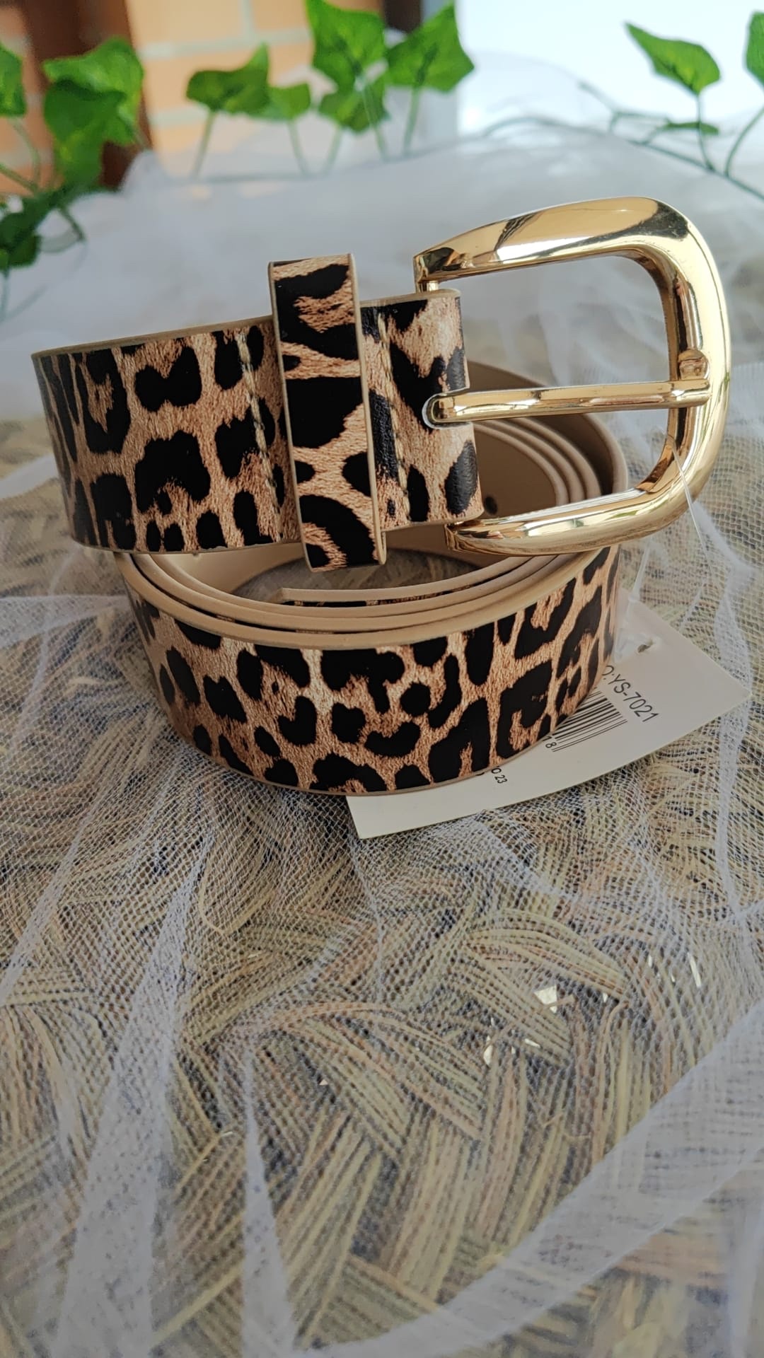 CINTURON DE POLIPIEL CON ESTAMPADO DE ANIMAL PRINT Y HEBILLA DORADA.