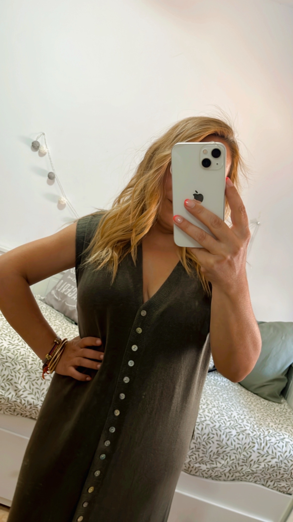 CHALECO DE PUNTO TOTALMENTE ABOTONADO QUE SE PUEDE UTILIZAR COMO VESTIDO SI LO LLEVAS CERRADO.