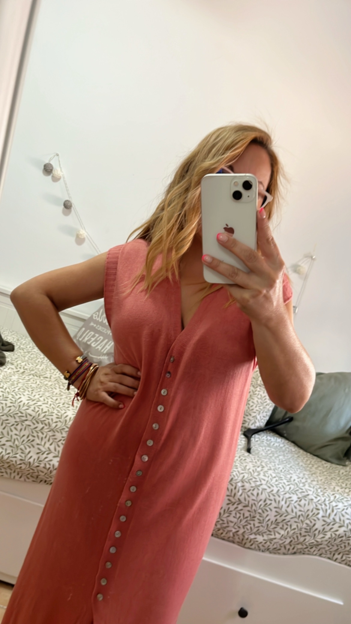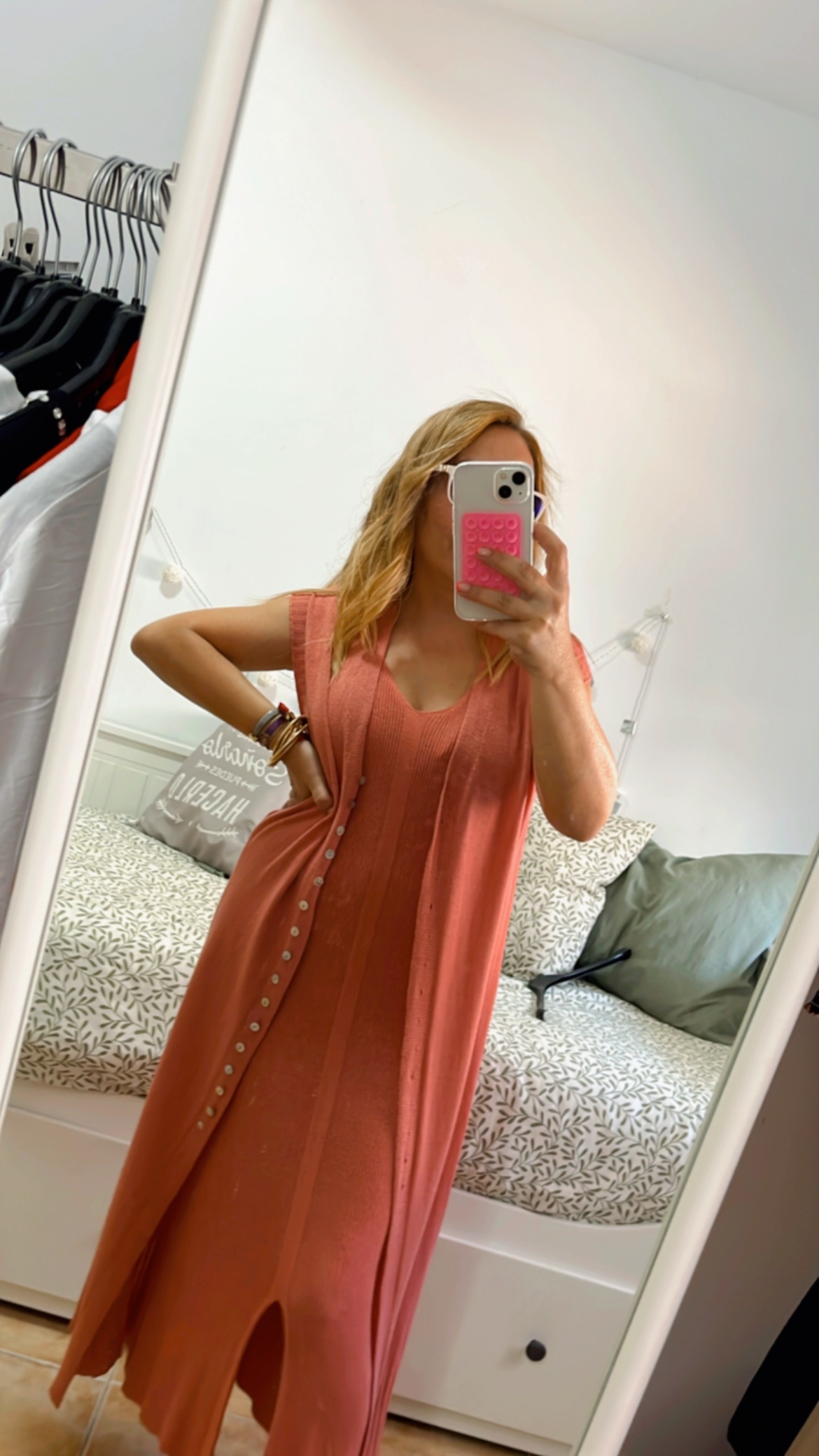 CHALECO DE PUNTO TOTALMENTE ABOTONADO QUE SE PUEDE UTILIZAR COMO VESTIDO SI LO LLEVAS CERRADO.